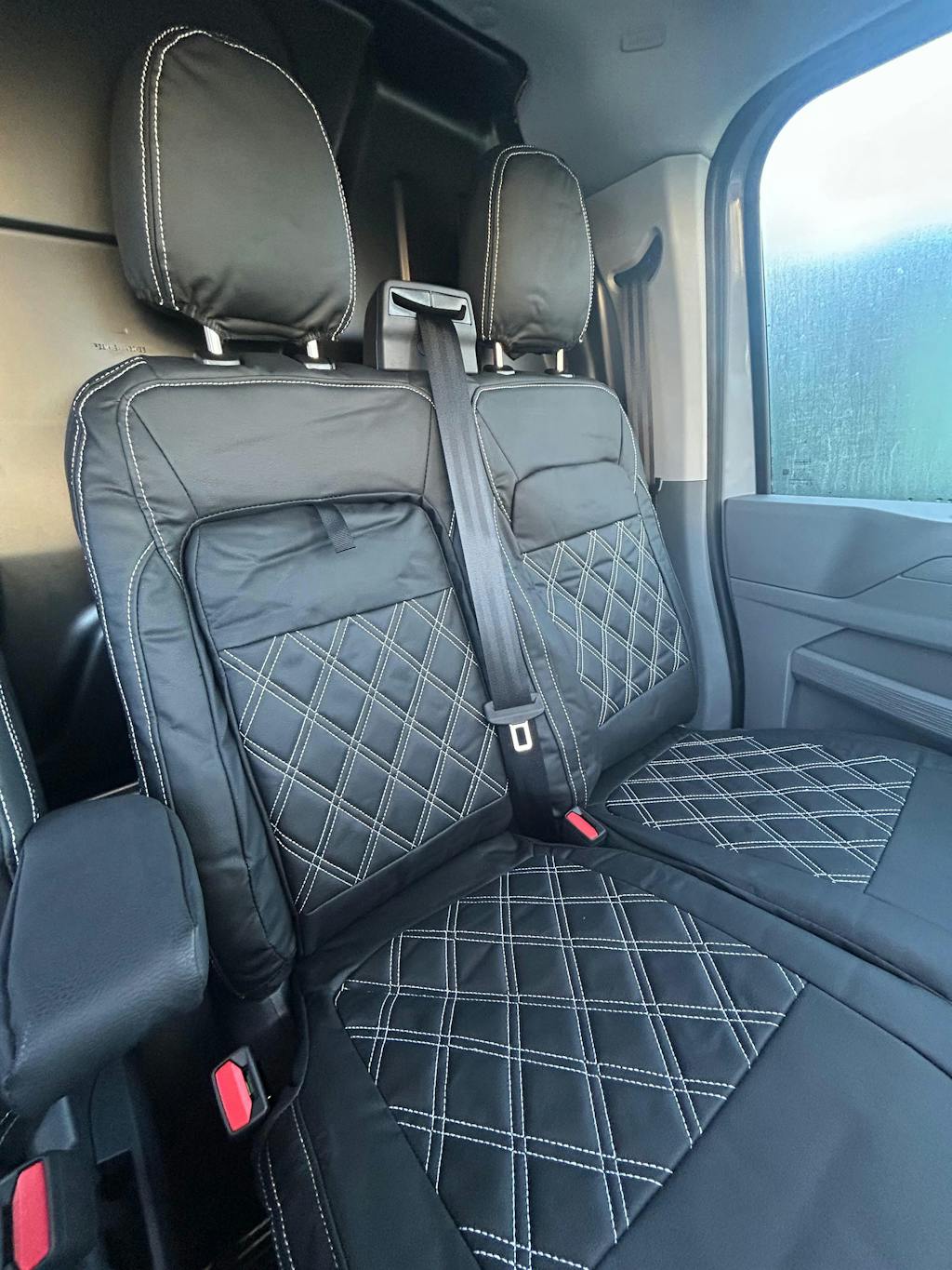 Make your van look as good as your work. These tailored leatherette seat covers are built to fit the latest Ford Transit Custom MK2 (2024 onwards) models with a fold-down tray on the double passenger seat – not for MS-RT or SPORT variants.