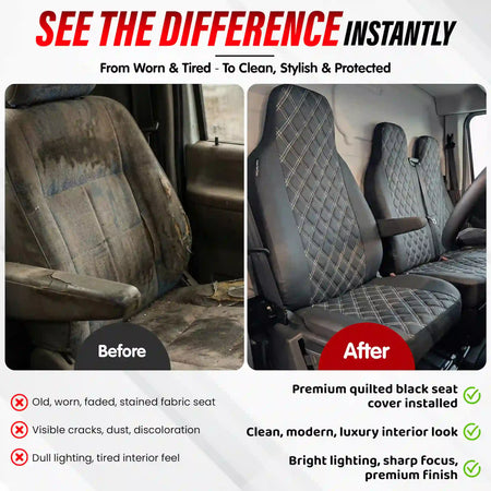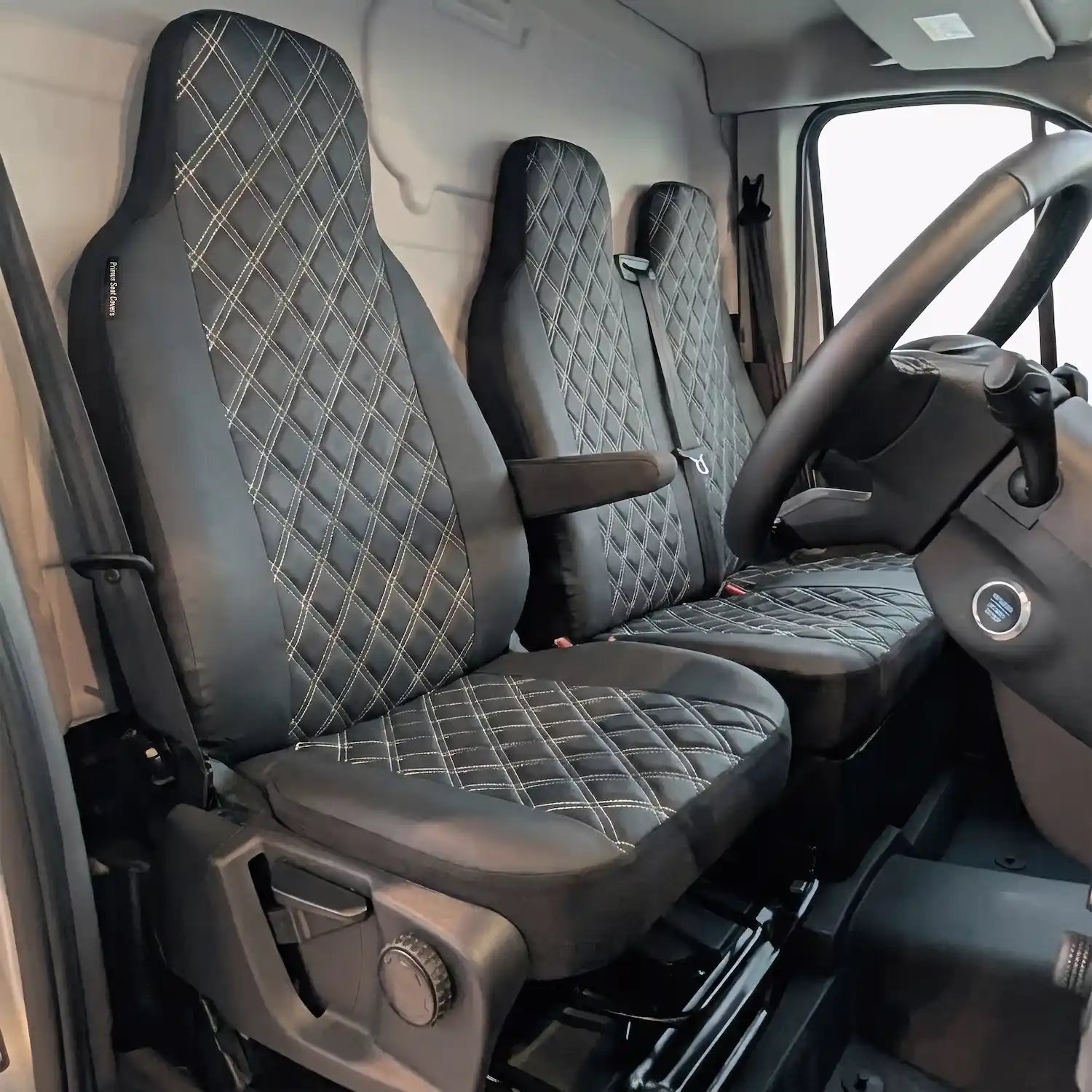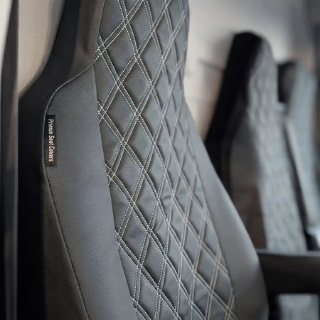 Made from heavy-duty PVC leatherette with a diamond stitch centre panel, these covers are waterproof, wipe-clean, foam-backed for comfort, and built for proper working vehicles.