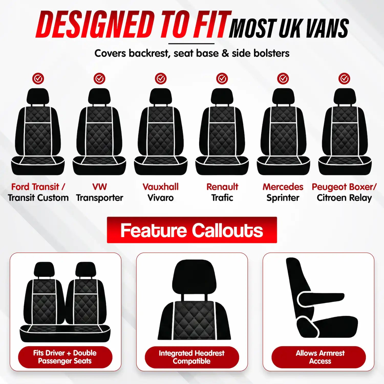 Fits UK Vans (Driver + Double Passenger Bench) – universal 3-seat front row fit